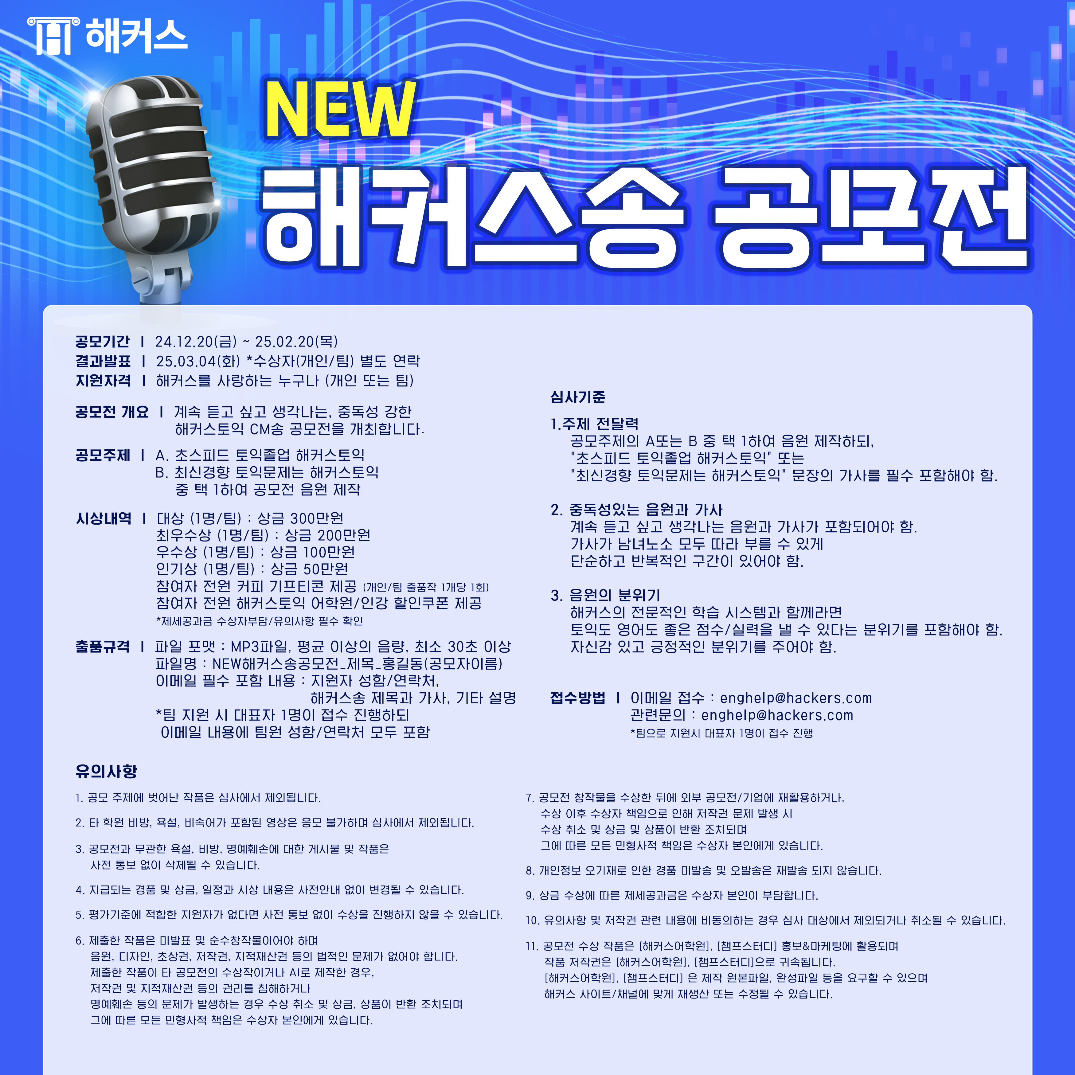 이메일 필수 포함 내용 : 지원자 성함/연락처, 해커스송제목과 가사, 기타 설명