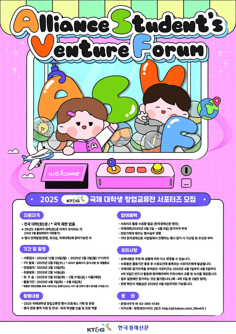 - 한국경제신문에서 ‘2025 KT&G 국제 대학생 창업교류전(ASVF)을 함께 운영할 서포터즈를 모집합니다.