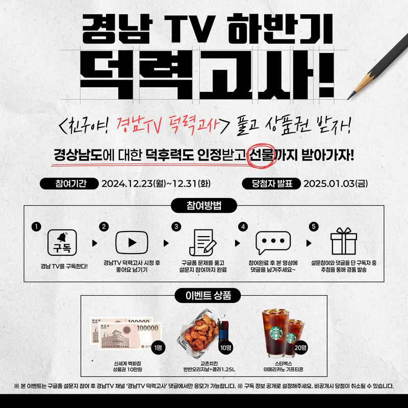 ※ 본 이벤트는 구글폼 설문지 참여 후 경남TV 채널 ‘경남TV 덕력고사’ 영상 댓글에서만 응모가 가능합니다.