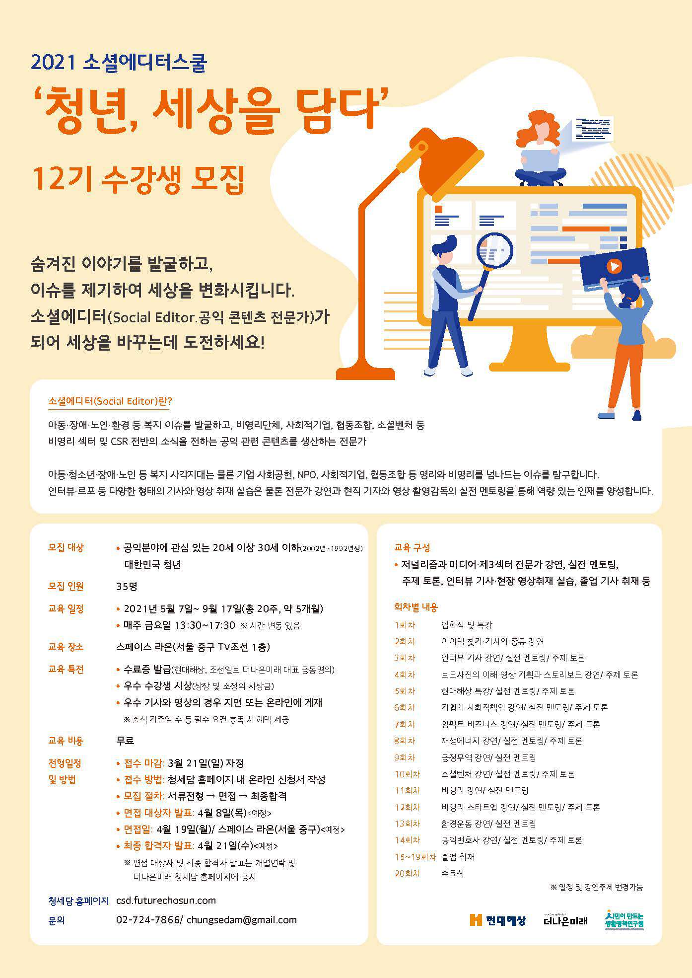 현대해상과 조선일보 더나은미래, 시민이 만드는 생활정책연구원은 공익분야 콘텐츠 전문 소셜에디터(Social Editor) 양성 프로그램인 ‘청년, 세상을 담다’(이하 청세담) 12기 수강생을 모집합니다.