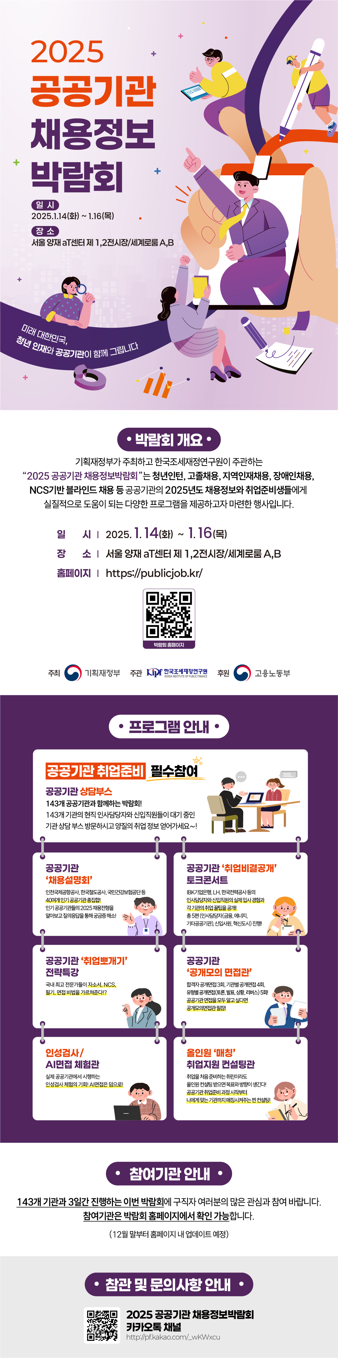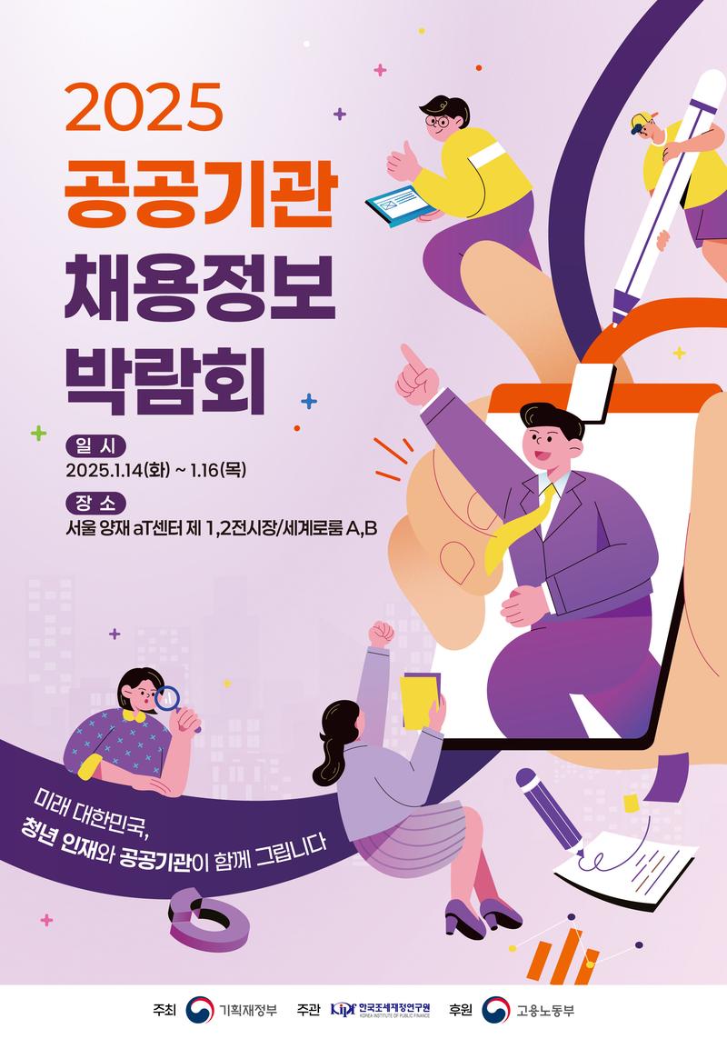 기획재정부 주최, 한국조세재정연구원이 주관하는 "2025 공공기관 채용정보박람회" 가 2025.1.14.(화) ~ 1.16.(목) 3일간 서울 양재 aT센터에서 개최됩니다.