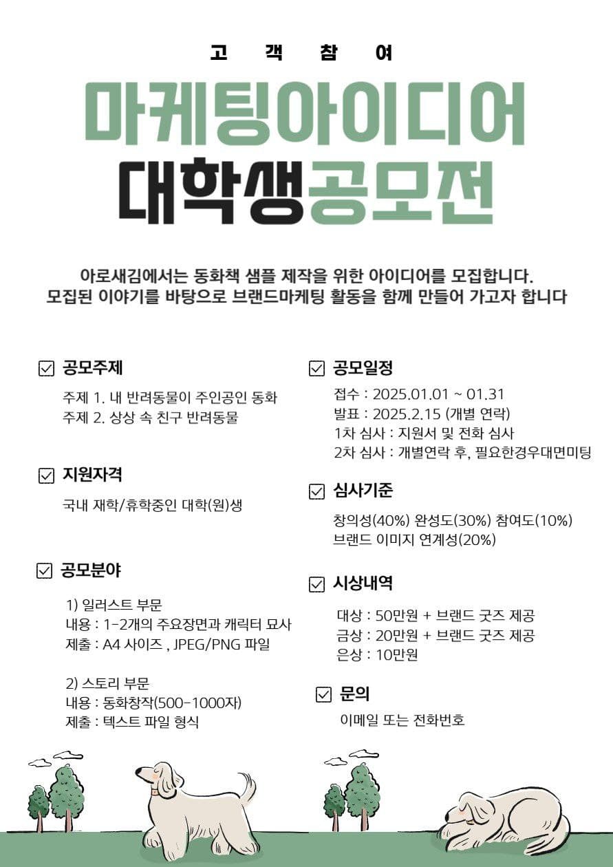 이번 공모전은 대학생들의 창의적이고 감성적인 아이디어를 바탕으로 반려동물을 주제로 한 동화책 샘플을 제작하는 기회를 제공합니다. 대학생들이 아이디어를 통해 반려동물을 주제로 한 감성적인 동화책을 제작함으로써, 브랜드와 소비자 간의 감성적 연결을 강화하고자 합니다.