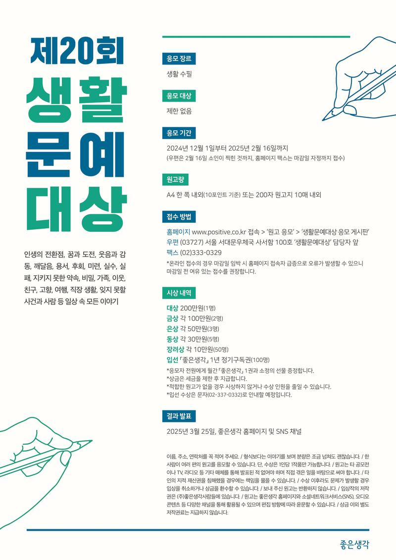 - 우편 : 03727 서울 서대문우체국 사서함 100호 ‘생활문예대상’ 담당자 앞