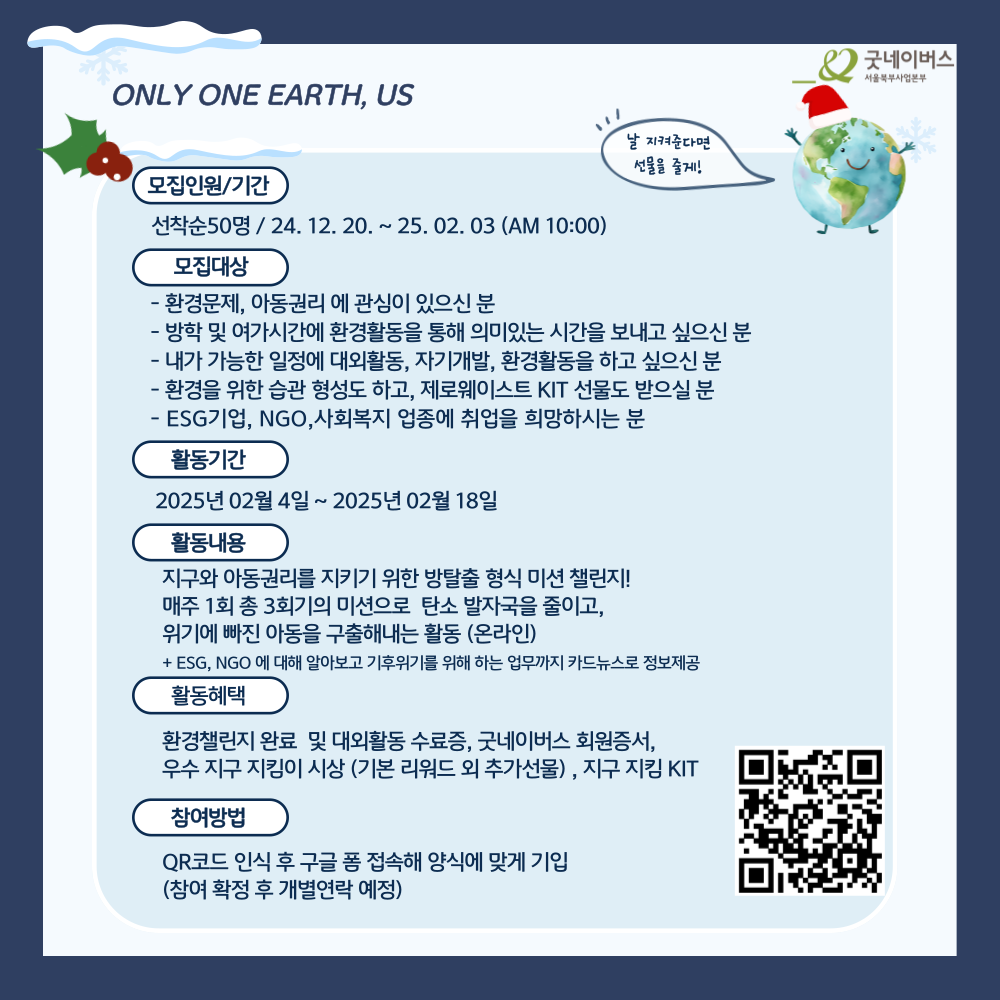 🚨취업에 도움되는 정보제공이 가득가득 추가된 ONLY ONE EARTH, US 6기~!지구와 아동권리를 지킬 준비가 된 지구 지킴이를 모집합니다!