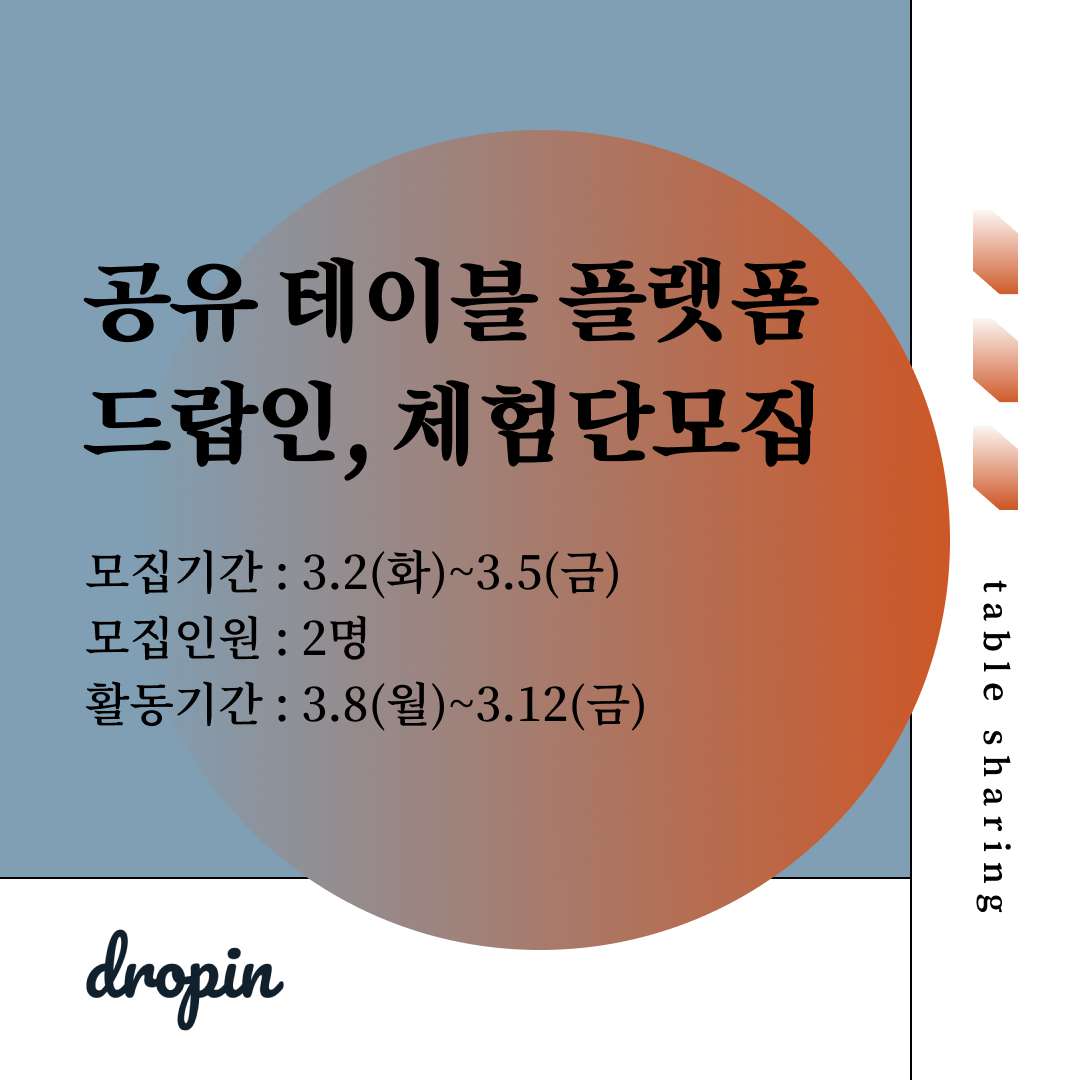 드랍인에서는 드랍인 서비스를 이용해볼 수 있는 체험단을 매주 모집하고 있습니다. 관심있는 분들의 많은 지원 부탁드립니다:D