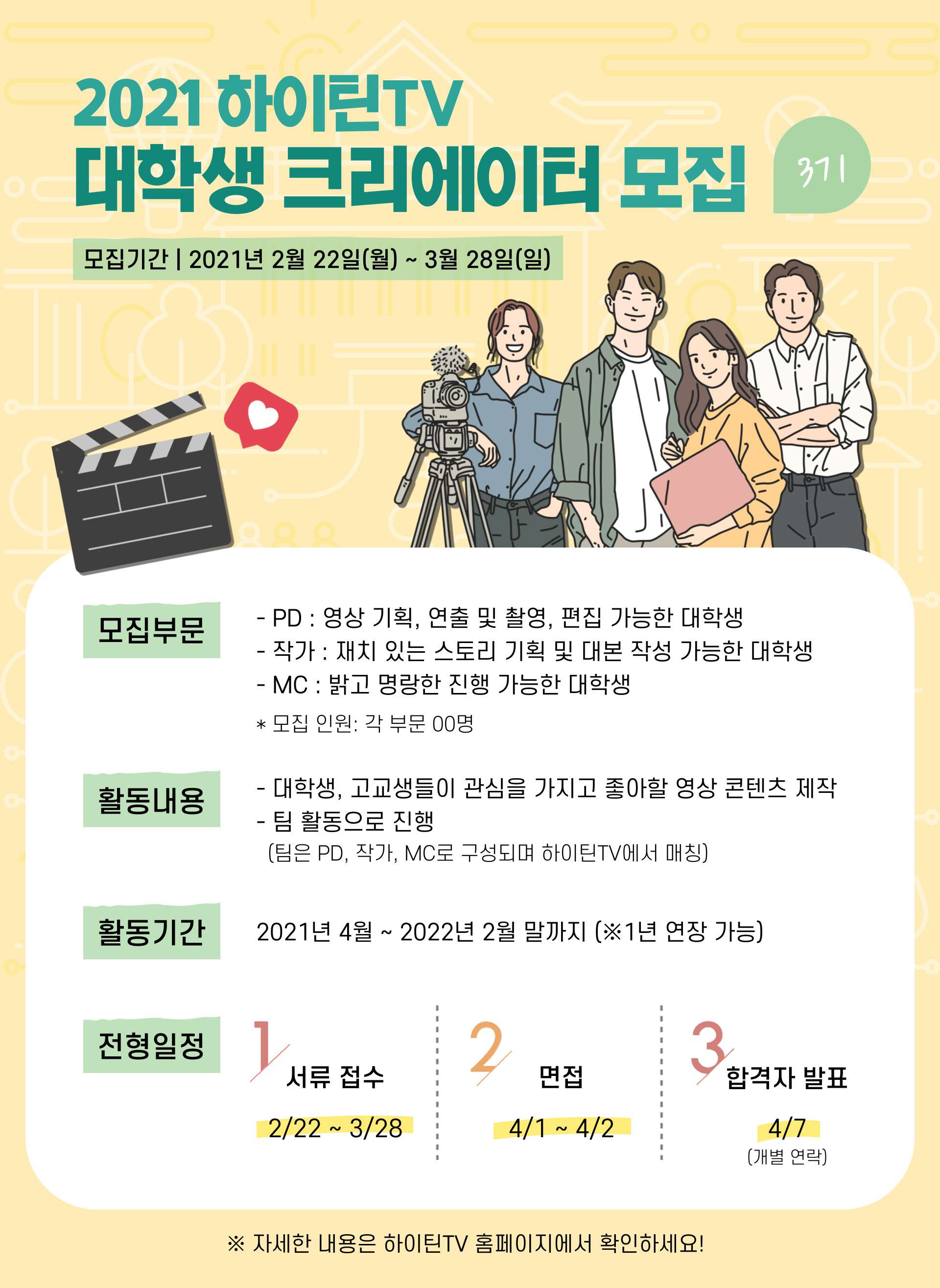- 하이틴TV에서 진행하는 기획 회의 참석 및 활동 가능한 대학생