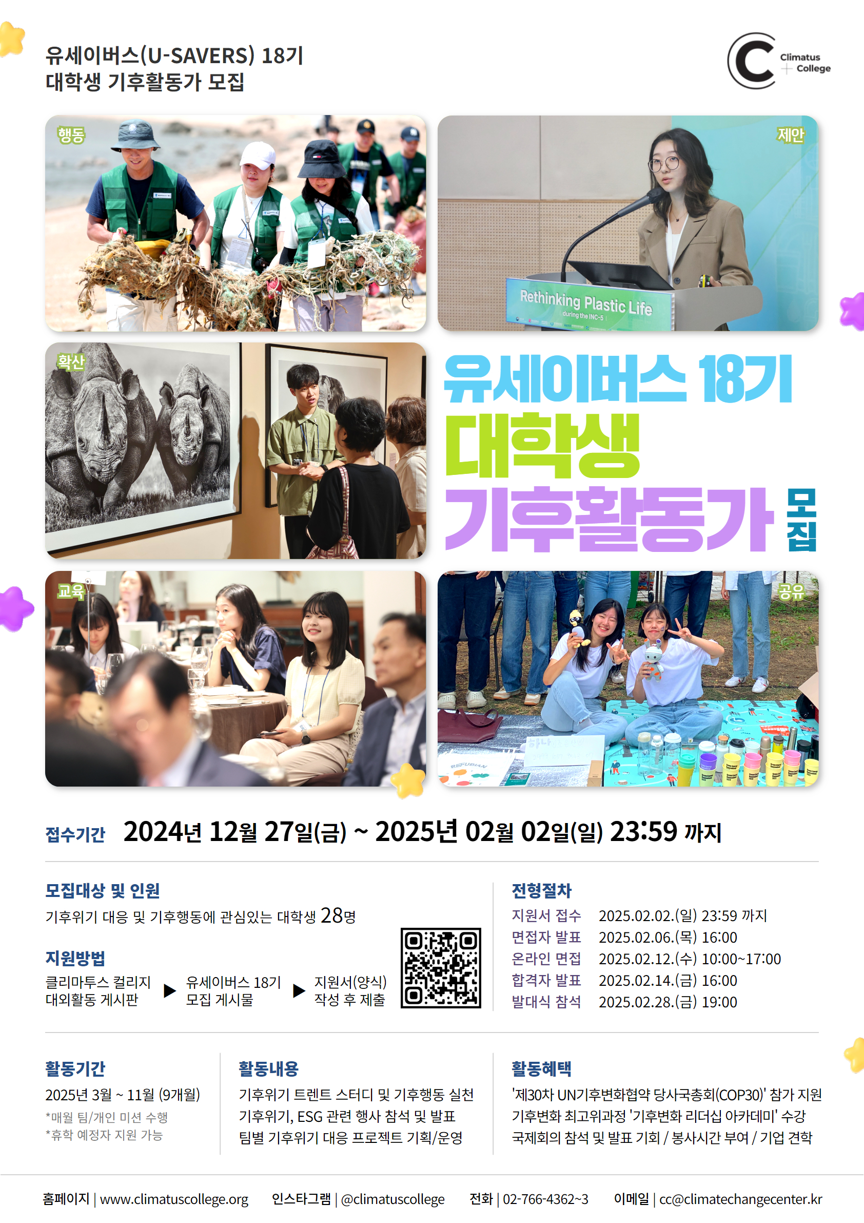 특히, U-SAVERS(유세이버스)는 약 65만 명의(2019~2024) 청년들이 참여한 기후 감수성 회복 플랫폼 클리마투스 컬리지를 이끄는 코어 그룹으로서, 기후위기의 피해자이자 해결의 주체인 청년들과 함께 기후위기 대응을 위한 다양한 활동들을 펼치고 있습니다.