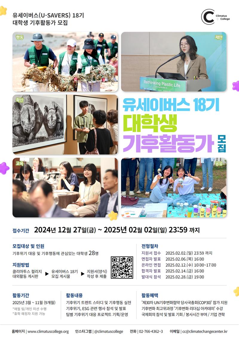 2025년 선발되어 함께 활동할 U-SAVERS(유세이버스) 18기는 교육, 행동, 제안 등 다양한 프로젝트를 기획하고 운영하며, 기후위기에 대한 사회적 공감대를 확산하고 더 나아가 기후위기 시대를 살아갈 본인의 기후역량을 강화하는 활동을 연간 진행하게 됩니다. (세부 팀 구성 및 연간 일정은 발대식에서 안내 예정)