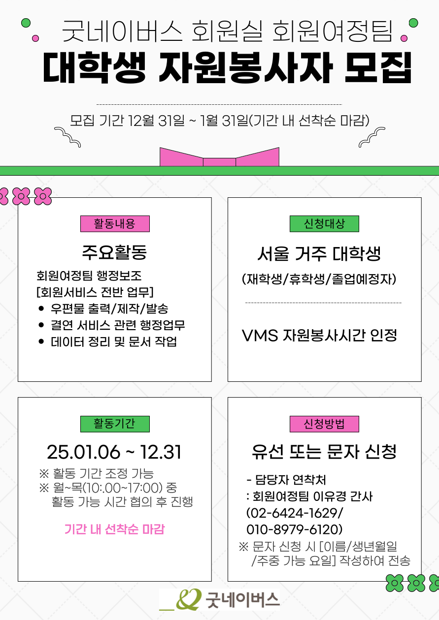 [굿네이버스 회원실 회원여정팀 대학생 자원봉사자 모집(~1/31까지)]