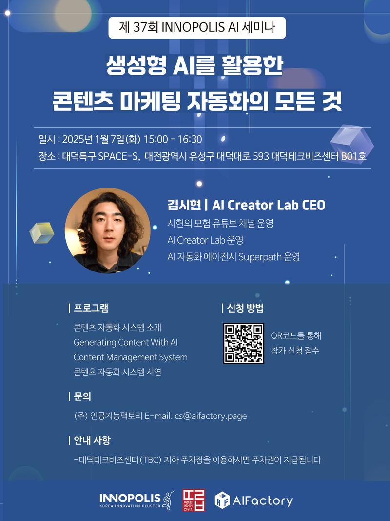 대덕특구 이노폴리스캠퍼스 (유형2) 창업기업 인큐베이터 공간인 SPACE-S에서 발굴한 입주기업, 예비 및 초기창업팀의 AI분야 전문기술지원을 위한 INNOPOLIS 제37회 AI 세미나를 진행합니다