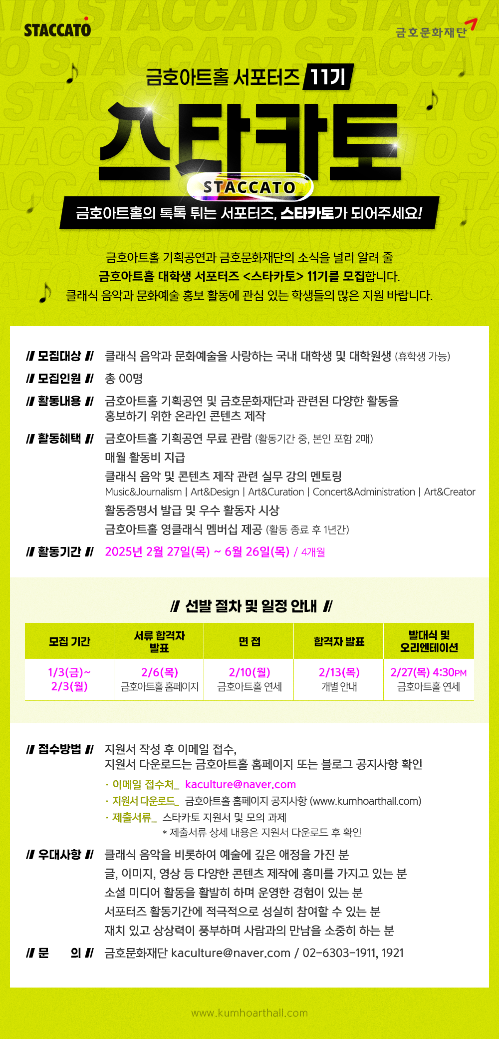 [금호문화재단] 2025 금호아트홀 서포터즈 <스타카토> 11기 모집 공고 (~2025/2/3)