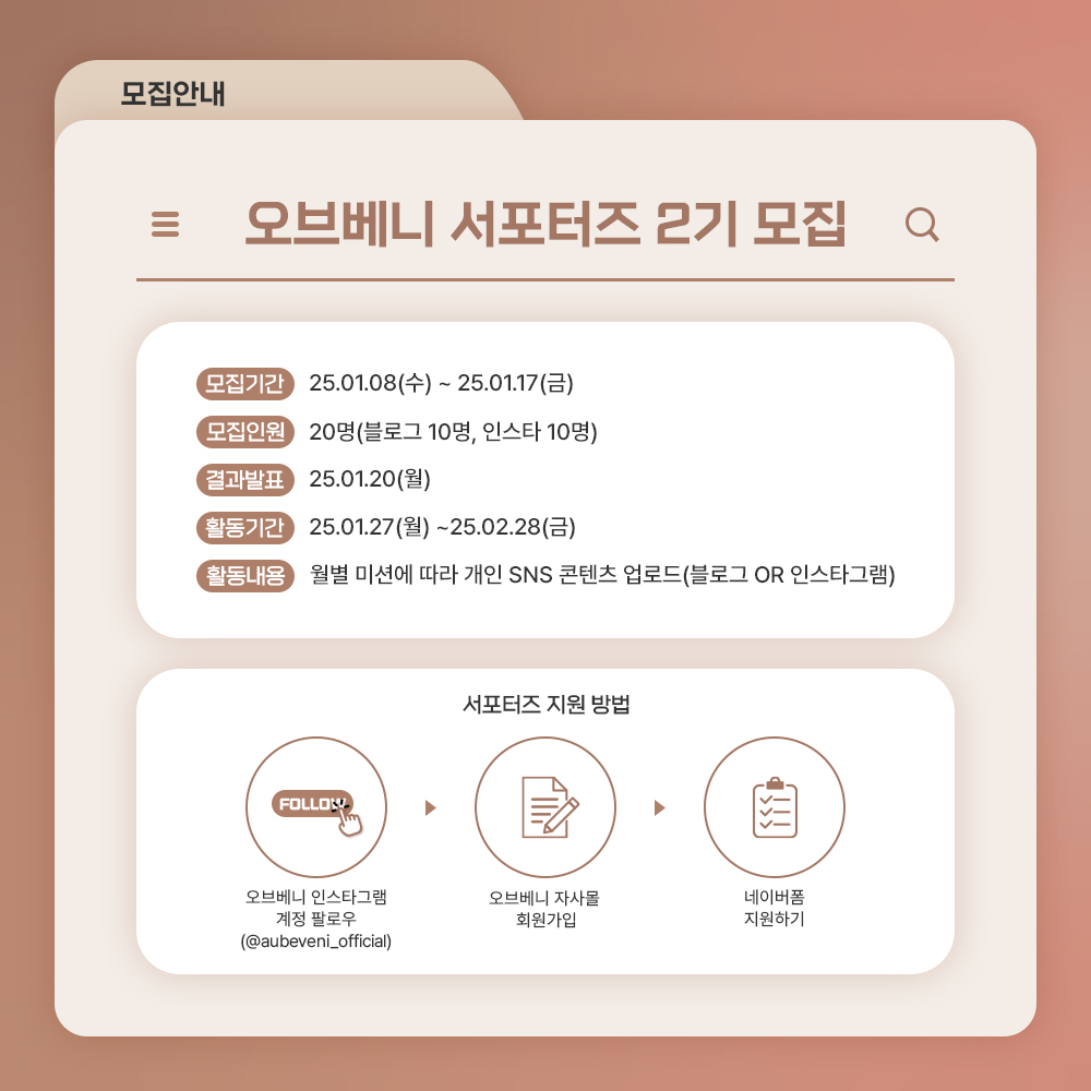오브베니 서포터즈 2기는 2025.01.08(수)부터 2025.01.17(금)까지 모집하오니