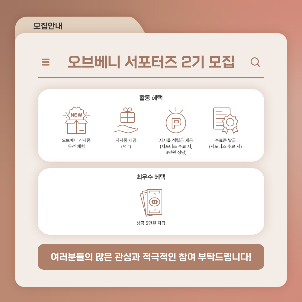 오브베니 서포터즈 2기와 함께하실 여러분들의 많은 관심과 참여를 기다립니다.