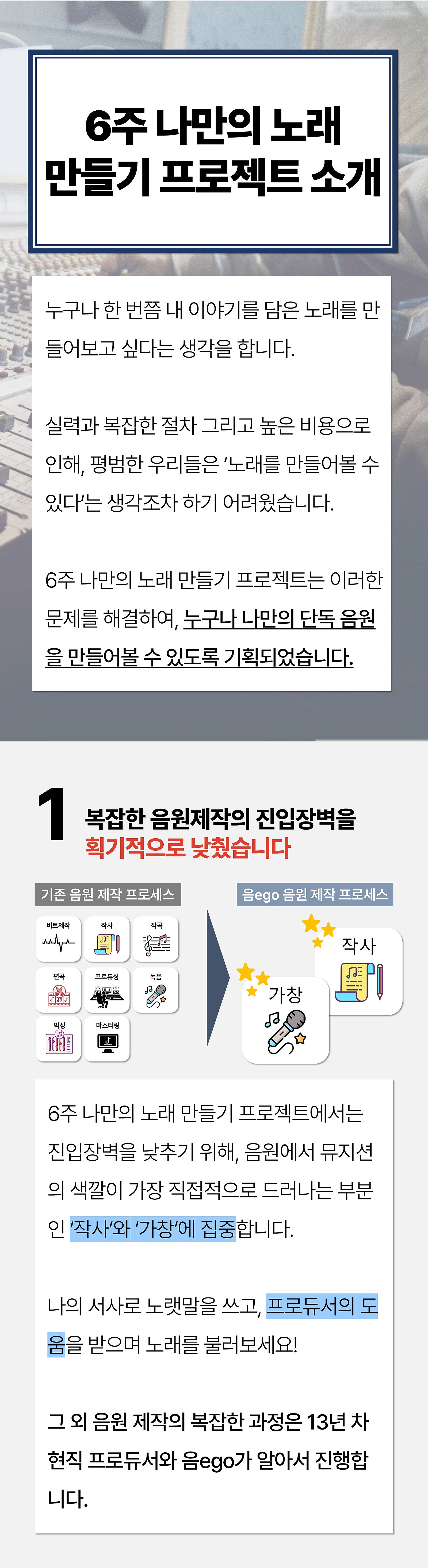 나의 이야기를 노래에 담는 것에만 집중하세요! 복잡한 음원 제작과 유통의 과정은 음ego에서 모두 담당합니다. 한번쯤 내 노래를 만들어보고 싶으셨던 분들에게 이 프로젝트를 추천해 드립니다.