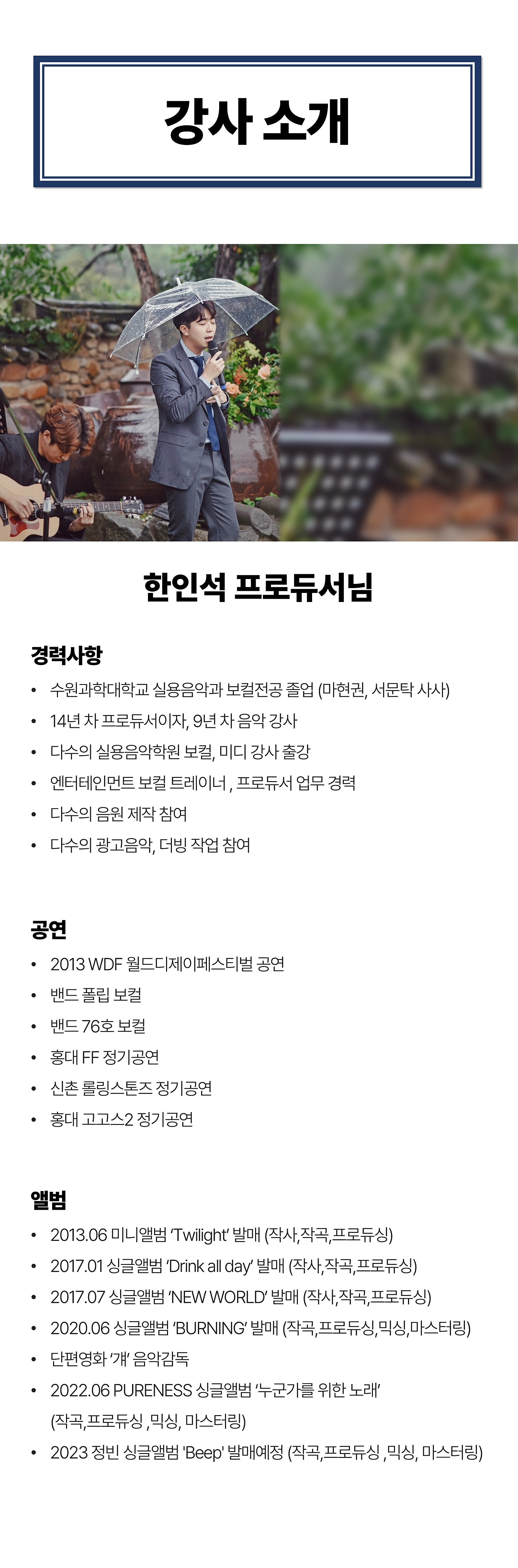 14년차 프로듀서님이 음원 제작의 기초를 알려주고, 1:1 피드백을 통해 음원의 완성도를 높입니다. 초보자도 원활히 참여할 수 있도록 전문 스튜디오에서 녹음 보정까지 진행하고 있습니다.