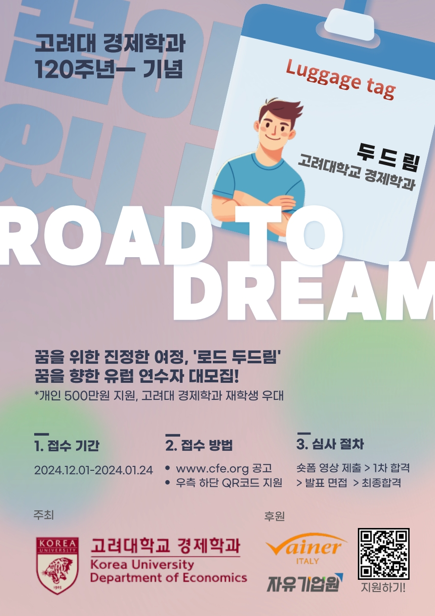 자유기업원과 고려대학교 경제학과가 공동 주최하는 로드 두드림(Road To Dream) 해외 연수 프로그램 참여자를 모집합니다. 타국에서 자유의 가치를 생생하게 느끼고자 하는 사람, 스스로의 꿈과 목표를 재발견하고자 하는 대학생이라면 누구나 자유롭게 참여 가능합니다. 많은 지원과 관심 부탁드립니다.