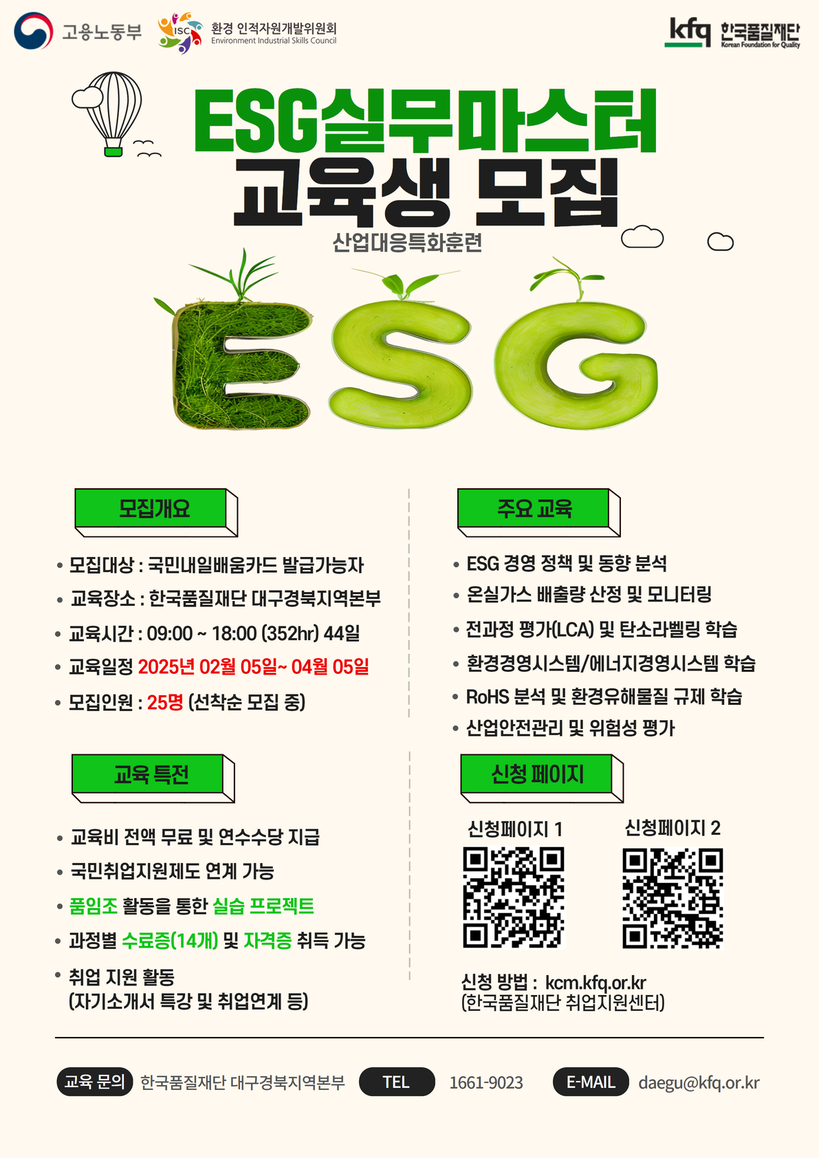 [한국품질재단 대구경북지역본부] ESG 실무 마스터 양성과 교육생 모집!