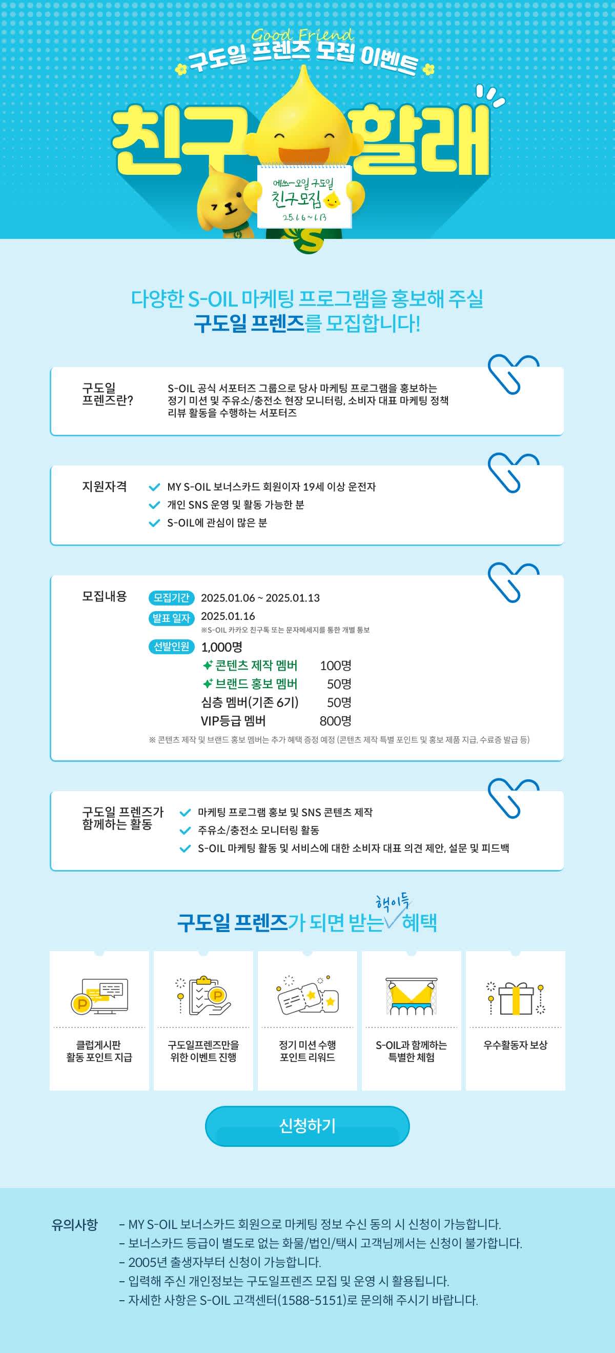 구도일프렌즈란 ? S-OIL 공식 서포터즈 그룹으로 당사 마케팅 프로그램을 홍보하는 정기 미션 및 주유소/충전소 현장 모니터링,
