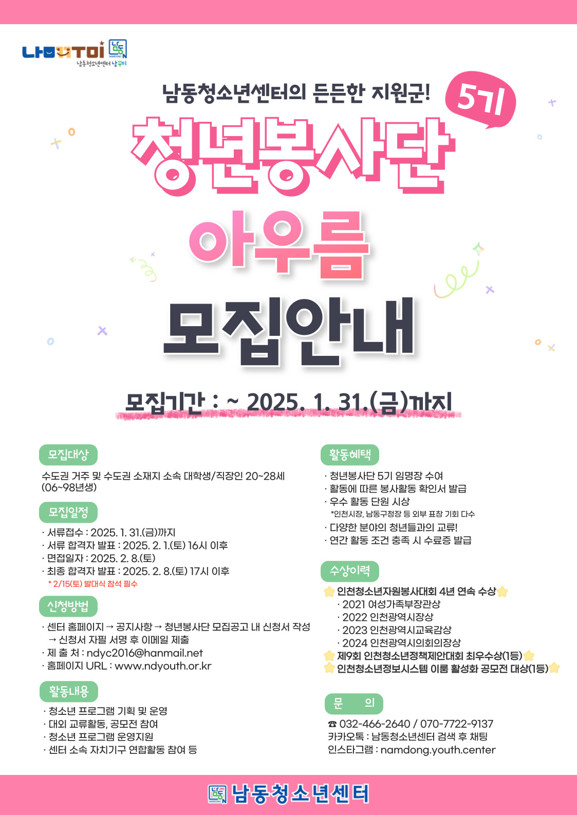 ■활동내용 : 청소년프로그램 기획 및 운영 / 대외 교류활동, 공모전 참여 / 청소년 프로그램 운영지원 / 남동청소년센터 소속 차지기구 연합활동 참여 등