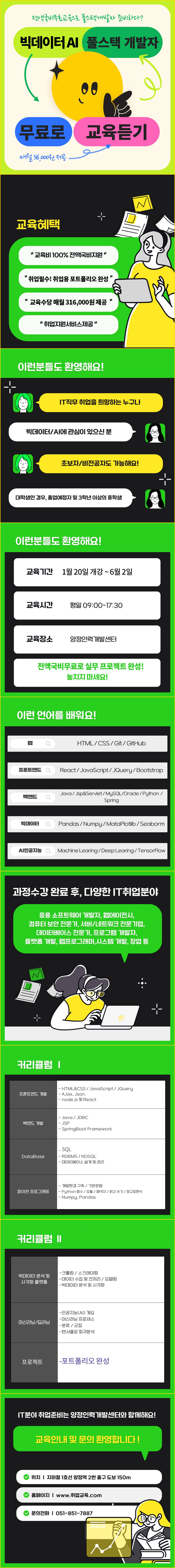 실무 중심 IT 전문가로 성장할 수 있는 최고의 기회! 빅데이터, AI, 클라우드, 풀스택 개발 기술을 마스터하고 2025년 새로운 커리어를 시작하세요.