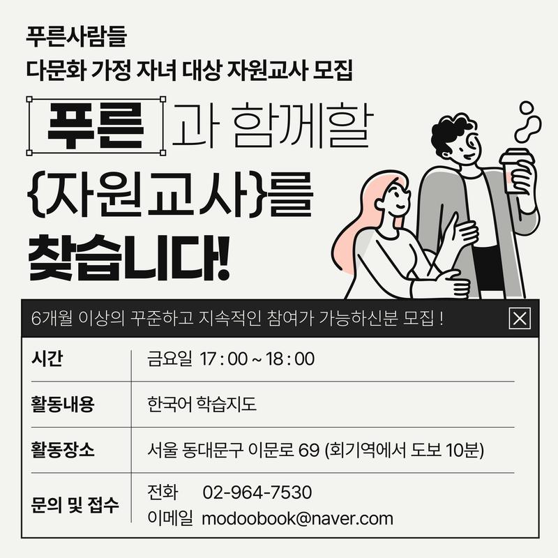 ✨다문화 가정 자녀 대상 자원 교사 모집✨ ● 참가 자격 대학생 , 주부, 직장인 모두 모두 환영 💖 (전공무관, 경력 무관) 배움과 나눔으로 행복을 느끼고 싶으신 분 다문화 가정 청소년과 함께하는 다양한 활동으로 기쁨을 나누실 분 6개월 이상의 꾸준하고 지속적인 참여가 가능하신 분 ● 활동 내용 다문화 가정 자녀 한국어 학습지도 (매주 금요일 17:00~18:00) ● 활동 혜택 1365 봉사시간 인정 ● 접수 일정 2025.01.10~모집 시 까지 ● 접수 연락처 / 문의사항 이메일 modoobook@naver.com 전화 02-964-7530 위의 방법으로 연락주세요 :) |