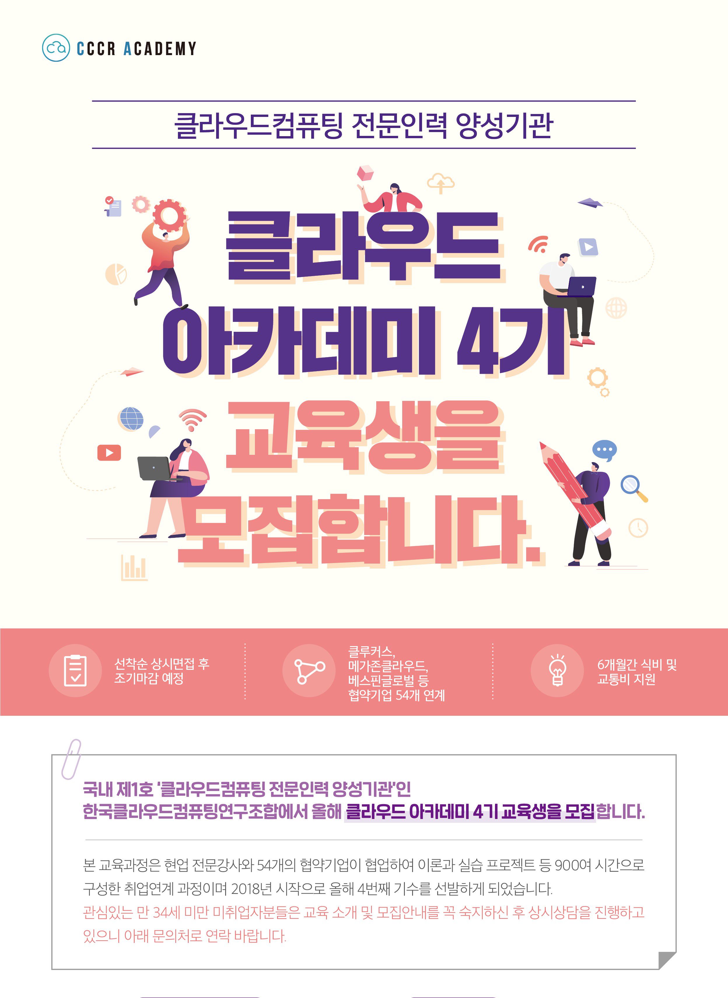 - 우수 교육생은 한국클라우드컴퓨팅연구조합 참여과제에 인턴기회 제공