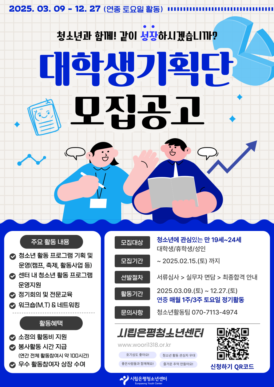 시립은평청소년센터의 청소년 프로그램 기획 및 운영에 주축이 되어 의미있고 보람찬 2025년을 함께 할 대학생기획단을 모집합니다!