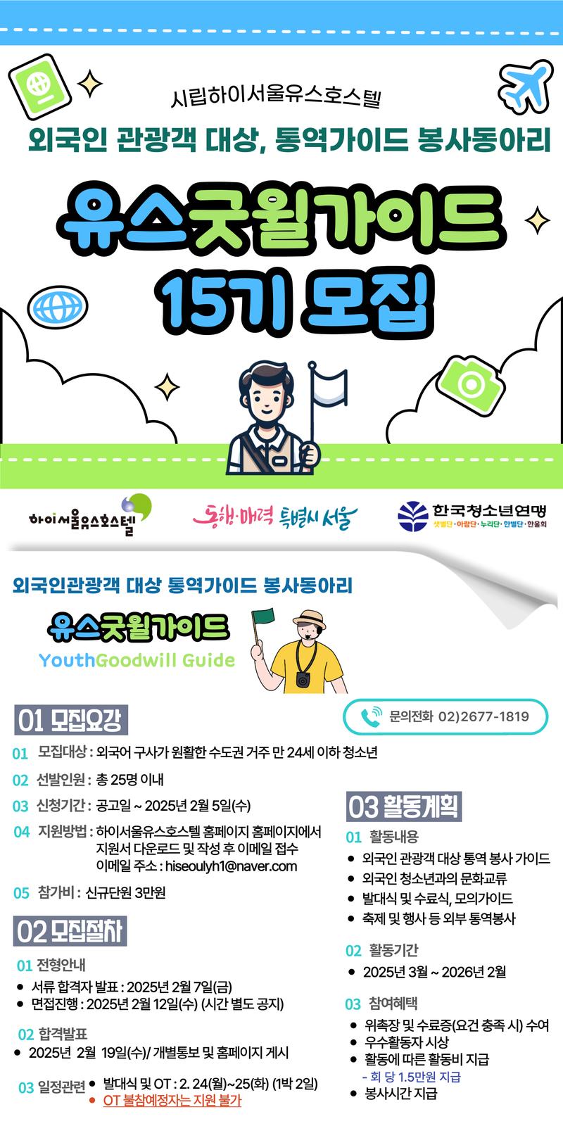 유스굿윌가이드는 서울을 방문하는 외국인들에게 한국과 서울의 문화를 알리며 민간 외교활동을 진행하는 시립하이서울유스호스텔 소속 서울투어가이드 청소년 봉사 동아리입니다. 시립하이서울유스호스텔에서는 외국어 구사가 원활한 대학생을 단원으로 선발하고자 하니 관심 있는 분들의 많은 지원 부탁 드립니다.