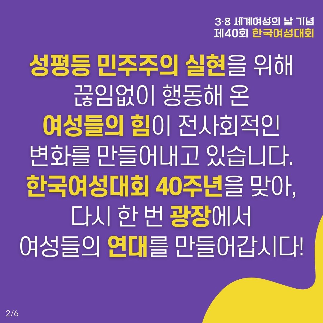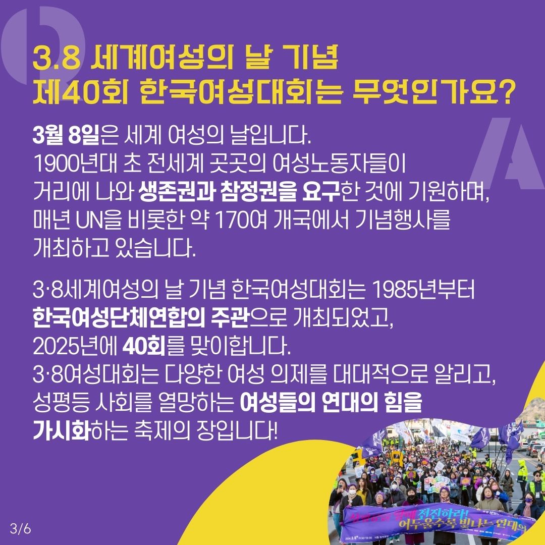 3.8세계여성의 날 기념 한국여성대회(이하 3.8여성대회)는 1985년부터 한국여성단체연합의 주관으로 개최되었고, 2025년에 40회를 맞이합니다. 3.8여성대회는 다양한 여성 의제를 대대적으로 알리고, 성평등한 사회를 열망하는 여성들의 연대의 힘을 가시화하는 축제의 장입니다!