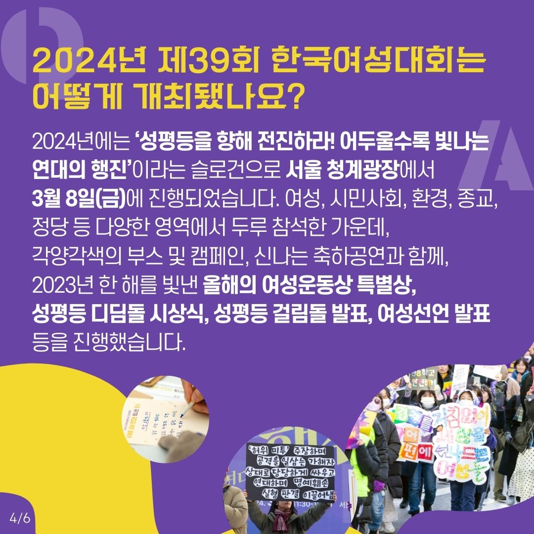 2024년에는‘성평등을 향해 전진하라! 어두울수록 빛나는 연대의 행진’이라는 슬로건으로 서울청계광장에서 3월 8일(금)에 진행되었습니다. 여성, 시민사회, 환경, 종교 정당 등 다양한 영역에서 두루 참석한 가운데, 각양각색의 부스 프로그램 및 캠페인, 신나는 축하공연과 함께, 2023년 한 해를 빛낸 올해의 여성운동상 특별상, 성평등 디딤돌 시상식, 성평등 걸림돌 발표, 여성선언 발표 등을 진행했습니다.