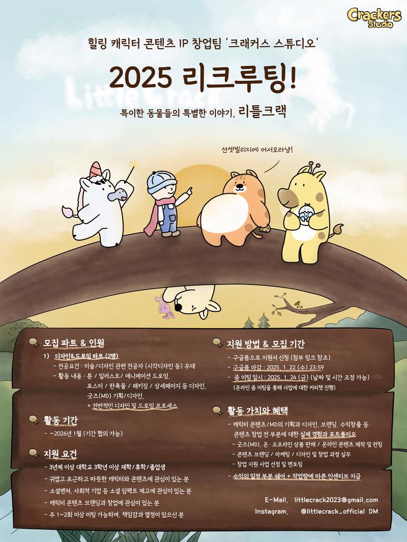 크래커스 스튜디오는 얼룩 없는 얼룩말, 목 짧은 기린과 같이 보편적이지 않은 특이한 모습의 캐릭터들의 특별한 이야기 '리틀크랙(Little Crack)'이라는 캐릭터 IP를 중심으로, '다름은 틀리지 않다'는 따듯하고 확고한 메시지를 내포해 우리 사회의 크고 작은 '다름'이라는 것을 바라보는 다각도의 시각과 이해, 포용의 가치를 온·오프라인 옴니채널을 통해 더욱 귀엽고, 재밌고, 자연스럽게 전달하고자 합니다.
