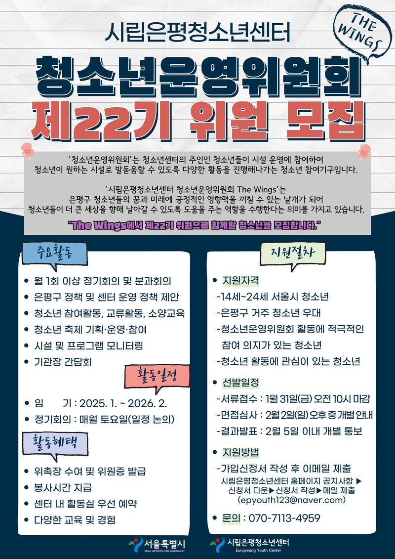 청소년운영위원회 'The Wings'는 '날개들'이라는 뜻으로 청소년운영위원회의 위원들이 은평구 청소년들의 꿈과 미래에 긍정적인 영향력을 끼칠 수 있는 날개가 되어우리 청소년들이 더 큰 세상을 향해 날아갈 수 있도록 도움을 주는 역할을 수행한다는 뜻을 의미합니다.