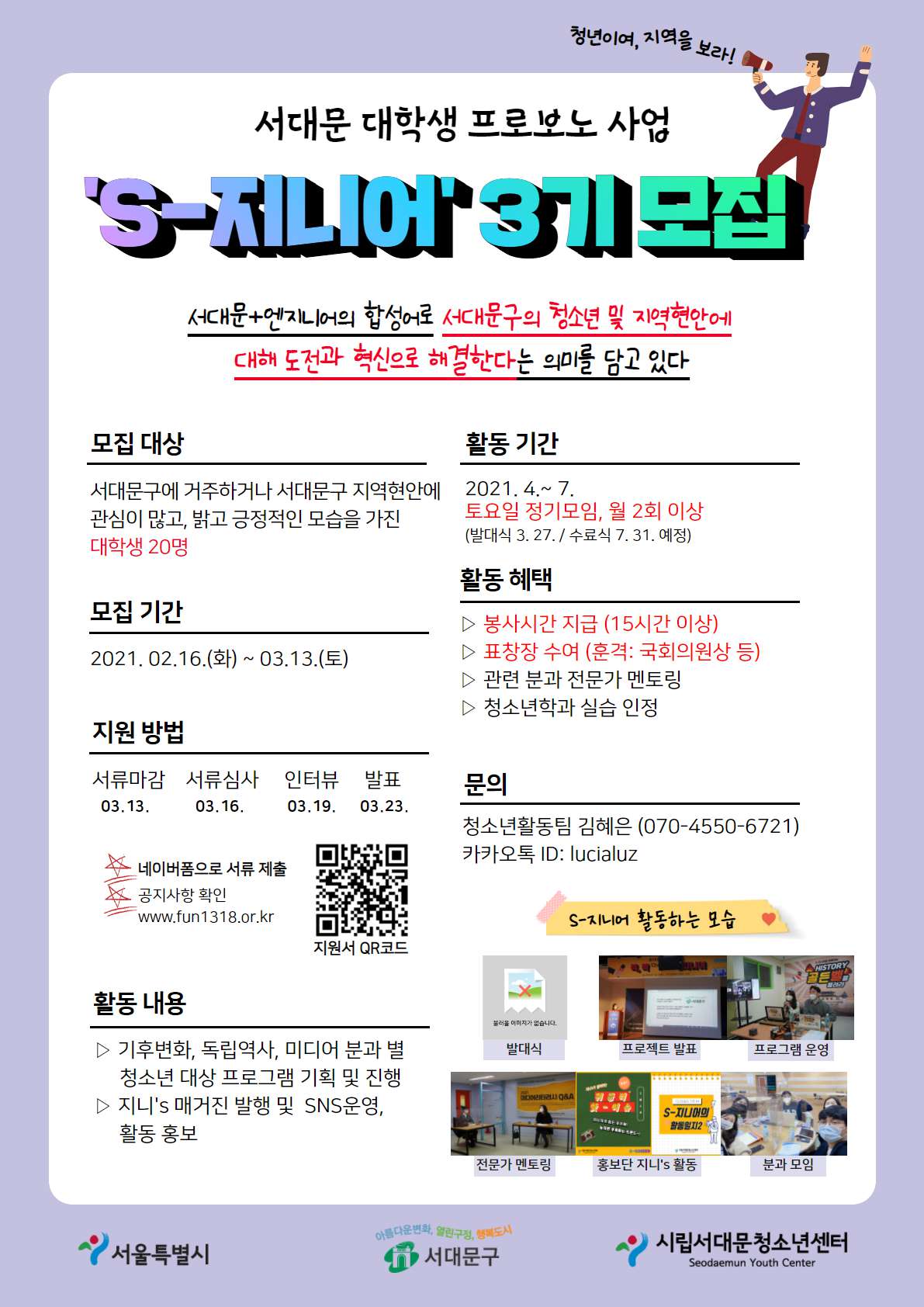 ■ 문의: 서울시립 서대문청소년센터 청소년활동팀 김혜은(070-4550-6721)/카카오톡ID:lucialuz