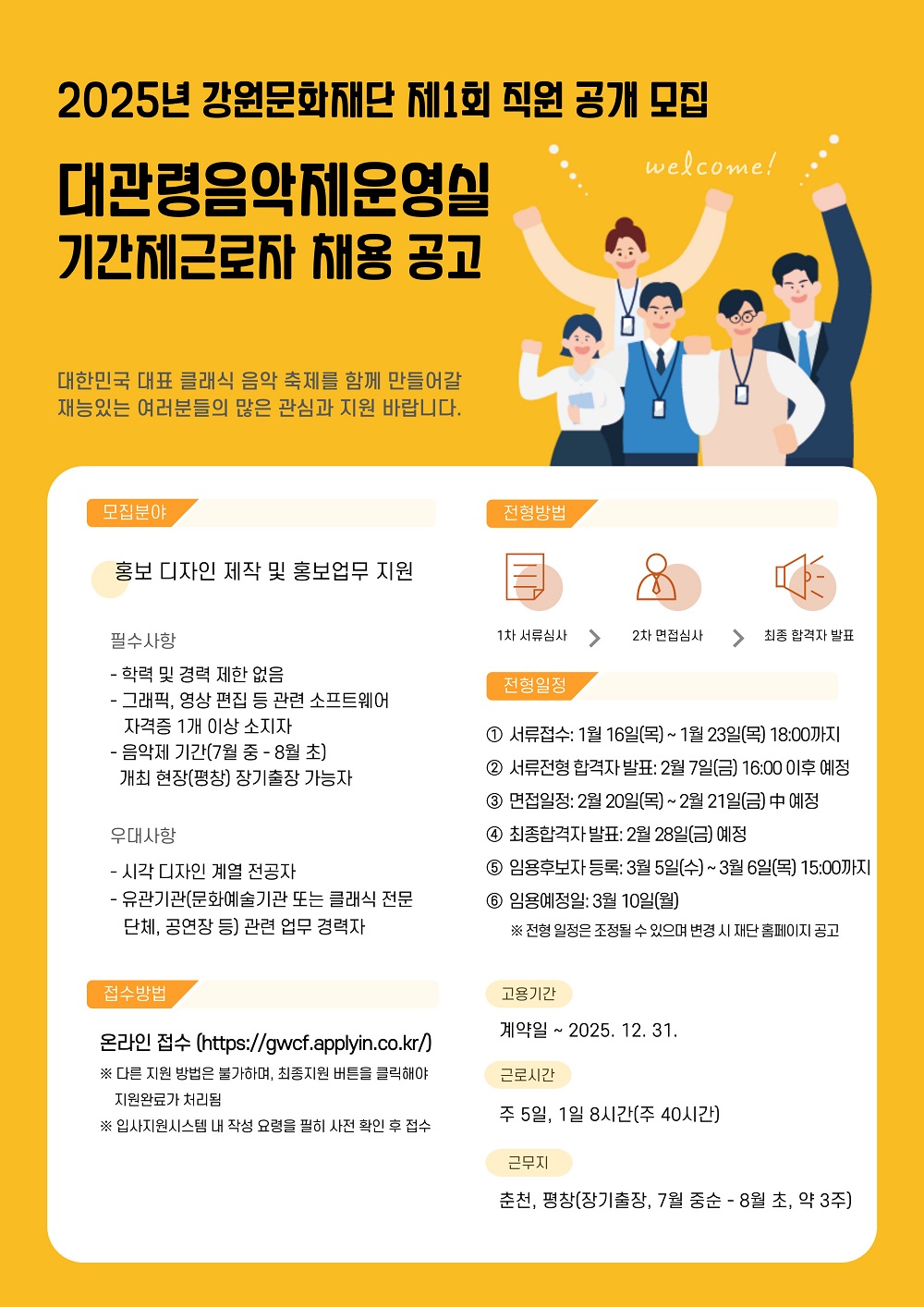 자세한 내용은 강원문화재단 홈페이지(gwcf.or.kr) 내 재단소식 > 채용공고 에서 확인하실 수 있습니다.
