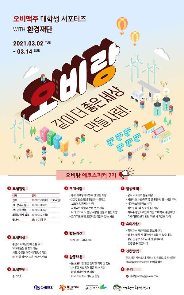 오비맥주 대학생서포터즈 "오비랑" 2기 환경재단과 함께하는 ECO SPEAKER 모집