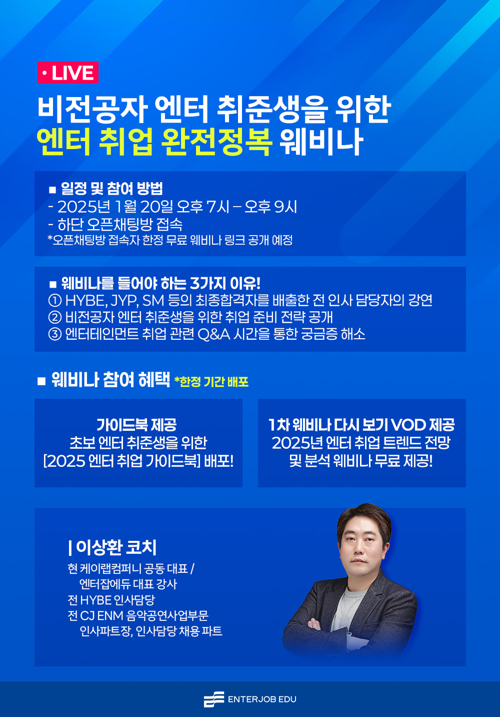 K-POP & 콘텐츠 산업 관련 온/오프라인 교육 플랫폼 : https://enterjobedu.co.kr/