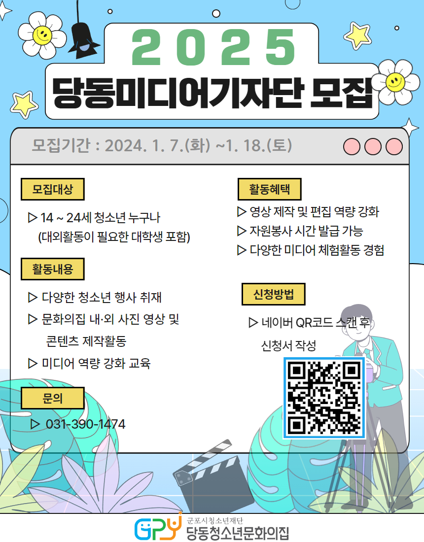 2024년에는 당동뉴스, 불법물예방캠페인(도박, 마약), 청소년웹진 등 다양한 미디어 콘텐츠물를 제작하였으며, 2025년에는 미디어 관련 전공 대학생까지 범위를 넓혀 다양한 콘텐츠를 기획 및 제작할 계획입니다~!
