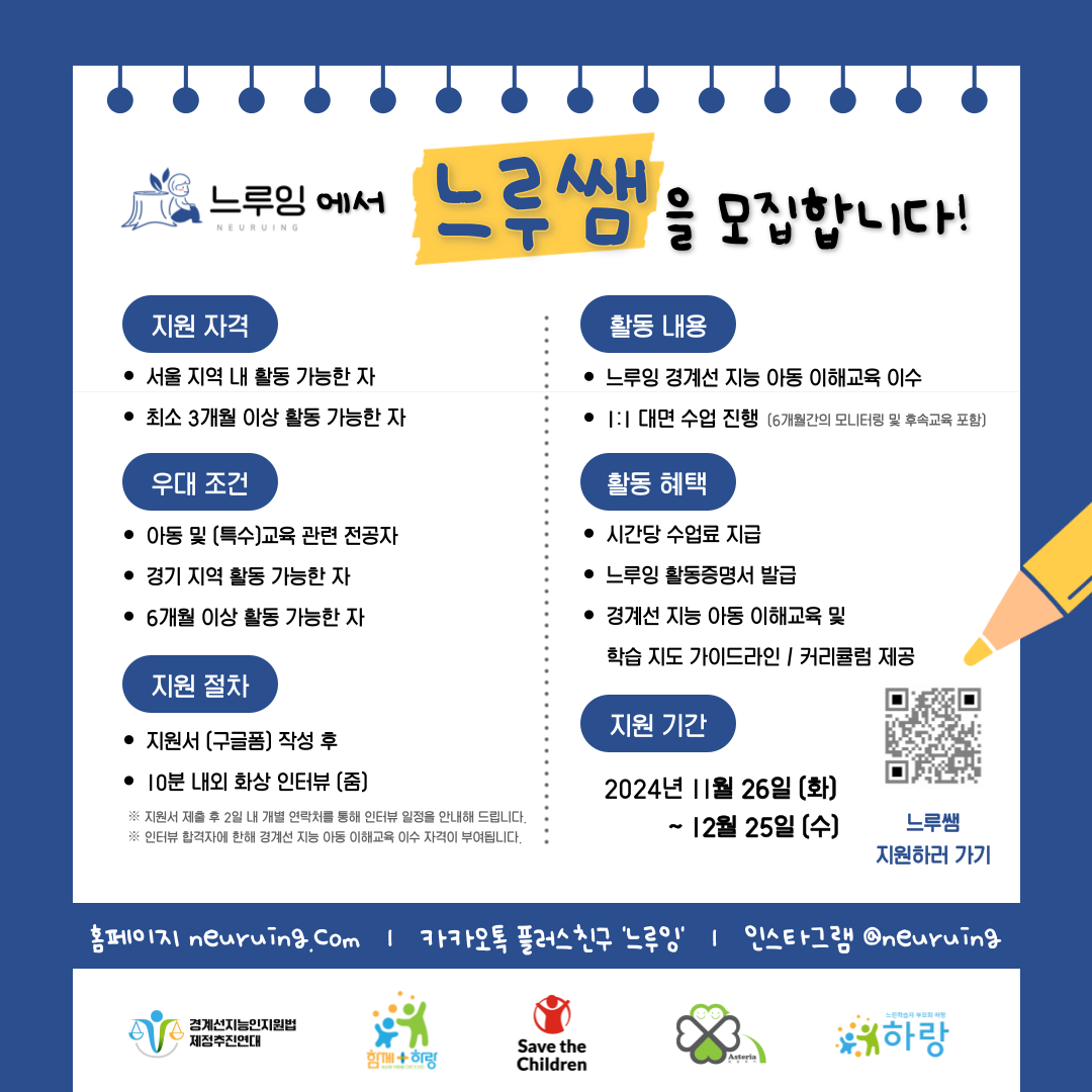 [느루잉] 경계선 지능 아이들의 하나뿐인 선생님! 느루쌤을 모집합니다!