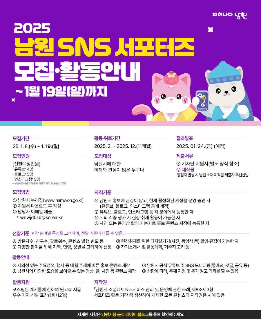 2025 남원시 SNS 서포터즈를 아래와 같이 모집 공고합니다.