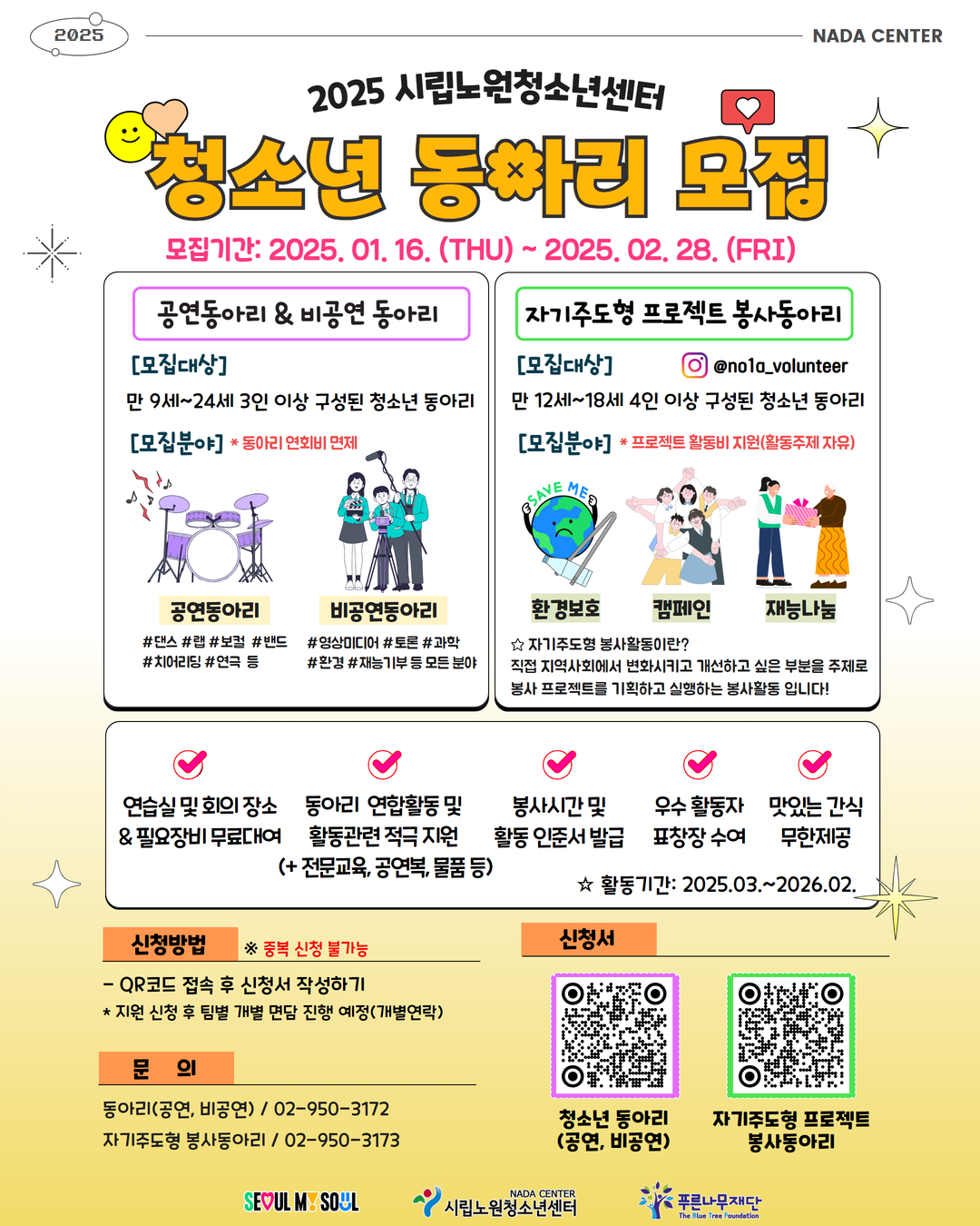 - 신청문의 : 동아리(공연, 비공연) 02-950-3172 / 자기주도형 봉사동아리 02-950-3173