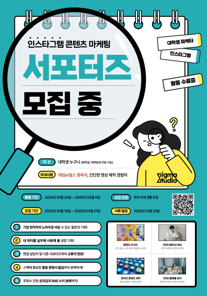 릴스 및 쇼츠 등 SNS 컨텐츠 기획, 제작해보는 ✅서포터즈✅를 모집중입니다!