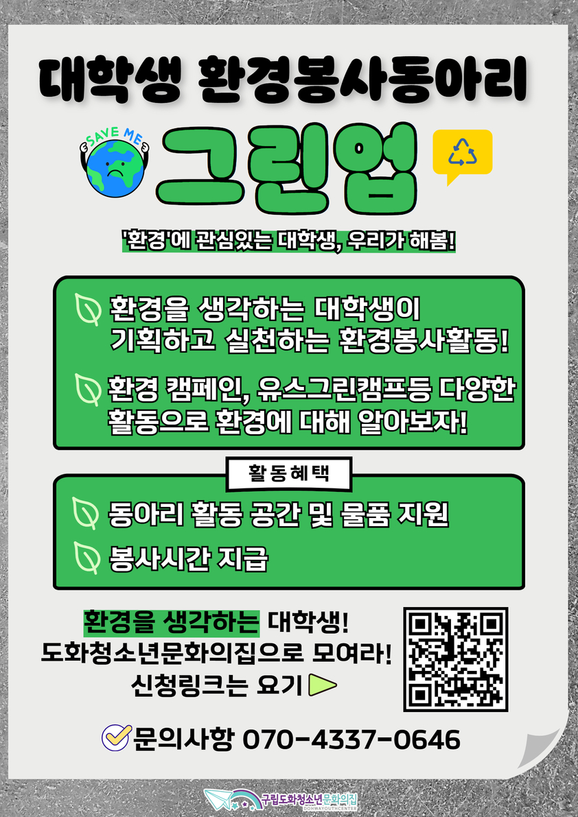 함께하고 싶은 대학생 친구들! 도화청소년문화의집에서 환경봉사동아리 해봅시다 :)
