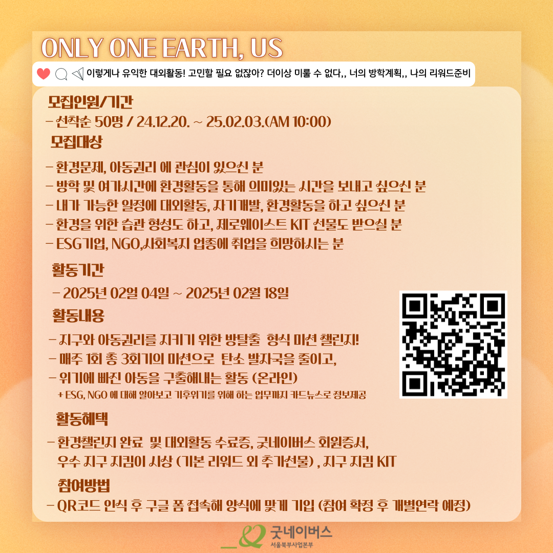 🚨취업에 도움되는 정보제공이 가득가득 추가된 ONLY ONE EARTH, US 6기~!지구와 아동권리를 지킬 준비가 된 지구 지킴이를 모집합니다!참여자 전원에게 제로웨이스트KIT 꾸러미가 증정 됩니다.