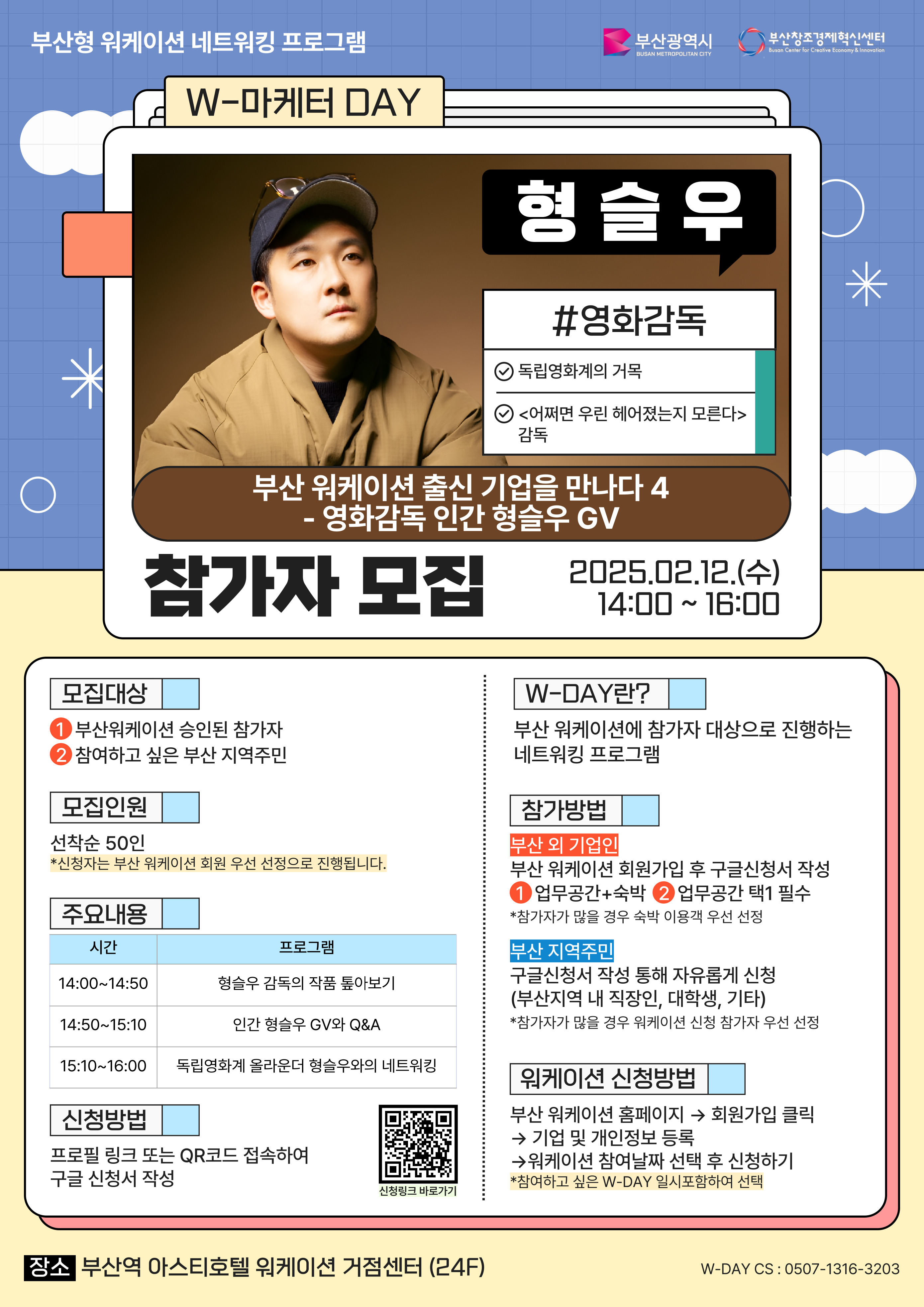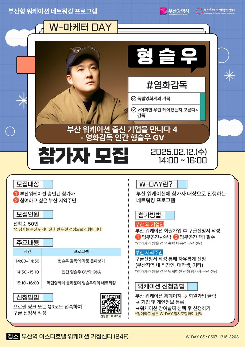 이번 W-마케터 DAY는 독립영화계의 올라운더! ' 부산 워케이션 출신 기업을 만나다4 - 영화감독 인간 형슬우 GV '로 형슬우 감독님과 함께 그의 작품을 톺아보고, 영화계의 비하인드 스토리를 들을 수 있는 특별한 시간이 마련되었습니다. 독립영화의 열정과 감독의 진솔한 이야기가 어우러진 이 자리를 놓치지 마세요!