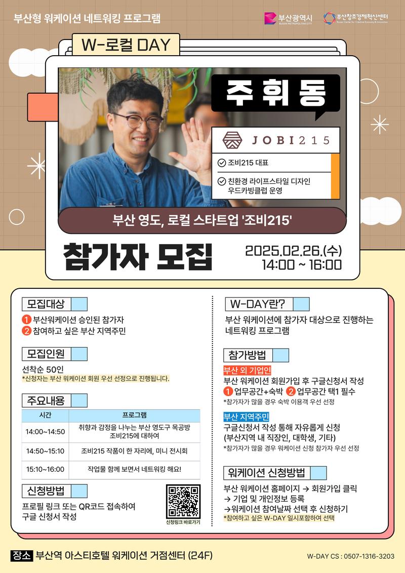 친환경 라이트스타일을 선도하며 우드카빙클럽을 운영하는 조비215의 대표, 주휘동님과 함께하는 특별한 시간! 이번 W-로컬 DAY에서는 부산 영도를 기반으로 한 로컬 스타트업, 조비215의 이야기를 들어보고, 그들만의 철학과 취향이 담긴 작품들을 한자리에서 감상할 수 있는 기회! 자연과 예술, 그리고 로컬 감성이 어우러진 특별한 순간을 함께하세요!