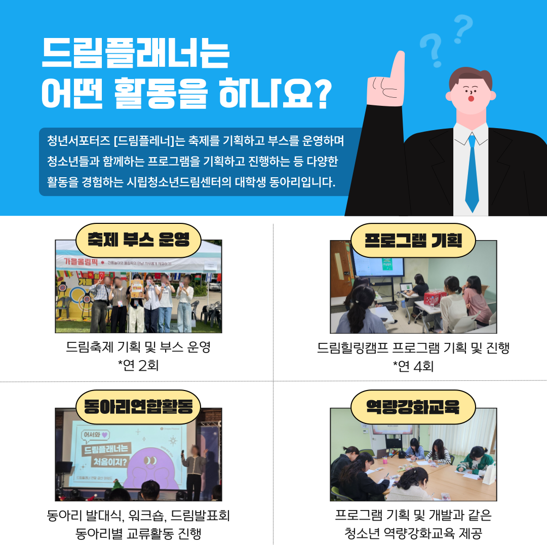 청년서포터즈 [드림플레너]는 축제를 기획하고 부스를 운영하며 청소년들과 함께하는 프로그램을 기획하고 진행하는 등 다양한 활동을 경험하는 시립청소년드림센터의 대학생 동아리입니다.