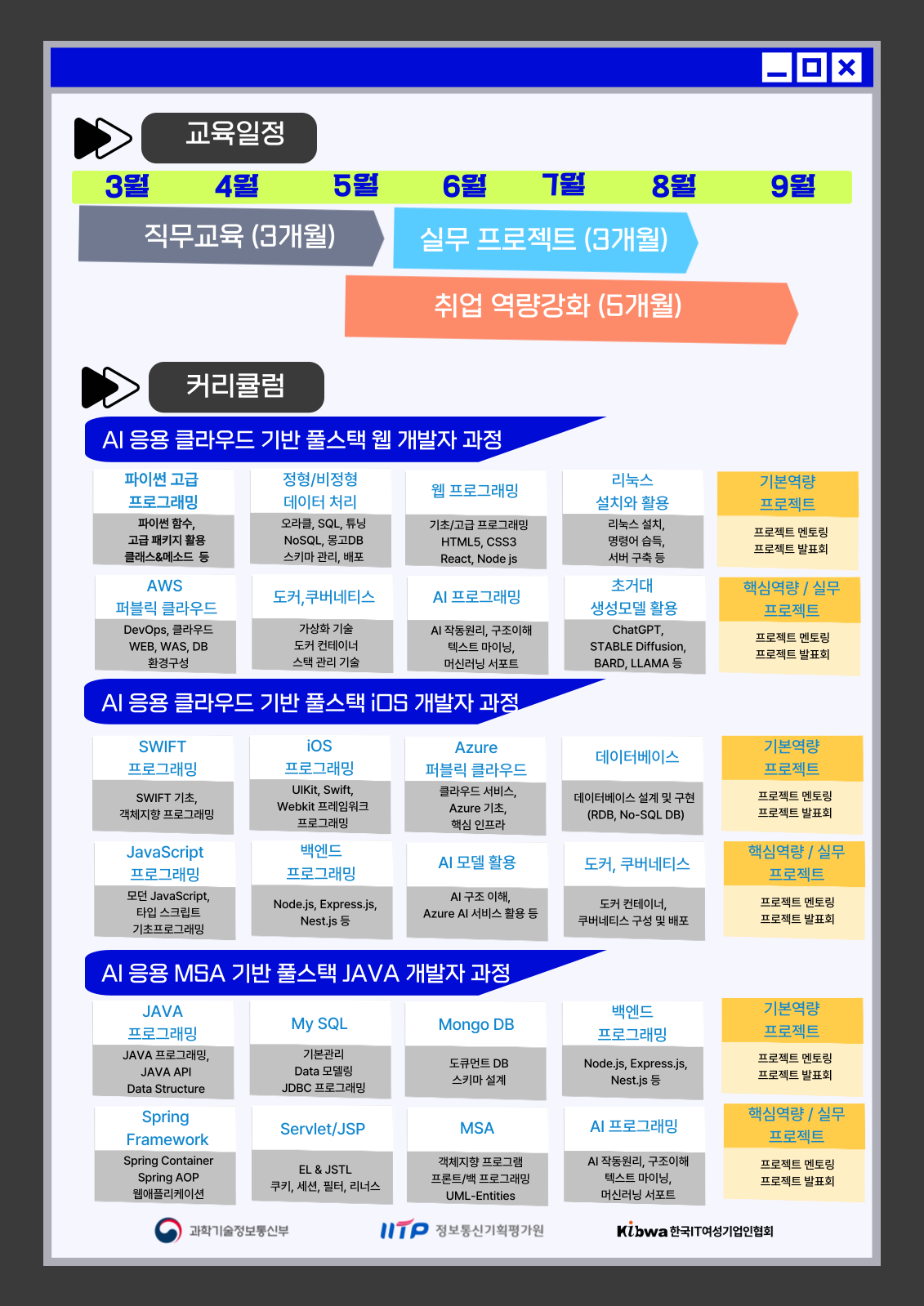 ㅁ 주요 과목: 파이썬, DB, iOS, React/node.js, DB(오라클), Spring, AWS, Azure, 도커, 쿠버네티스, MSA 등