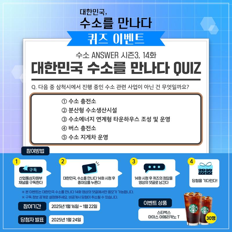 - 본 이벤트는 대한민국 수소를 만나다 14화 영상의 댓글에서만 응모가 가능합니다.