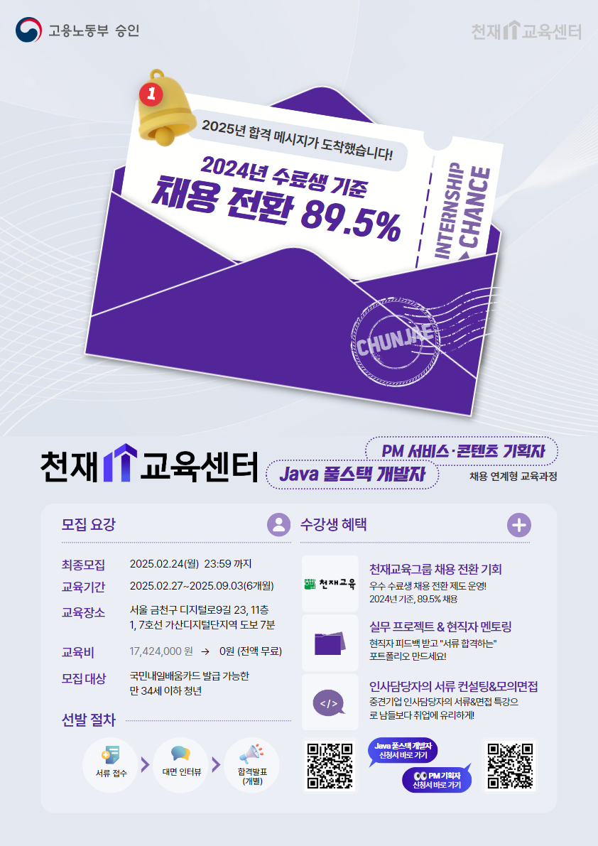 - 교육장소: 1, 7호선 가산디지털단지역 마리오아울렛2관 11층 천재IT교육센터