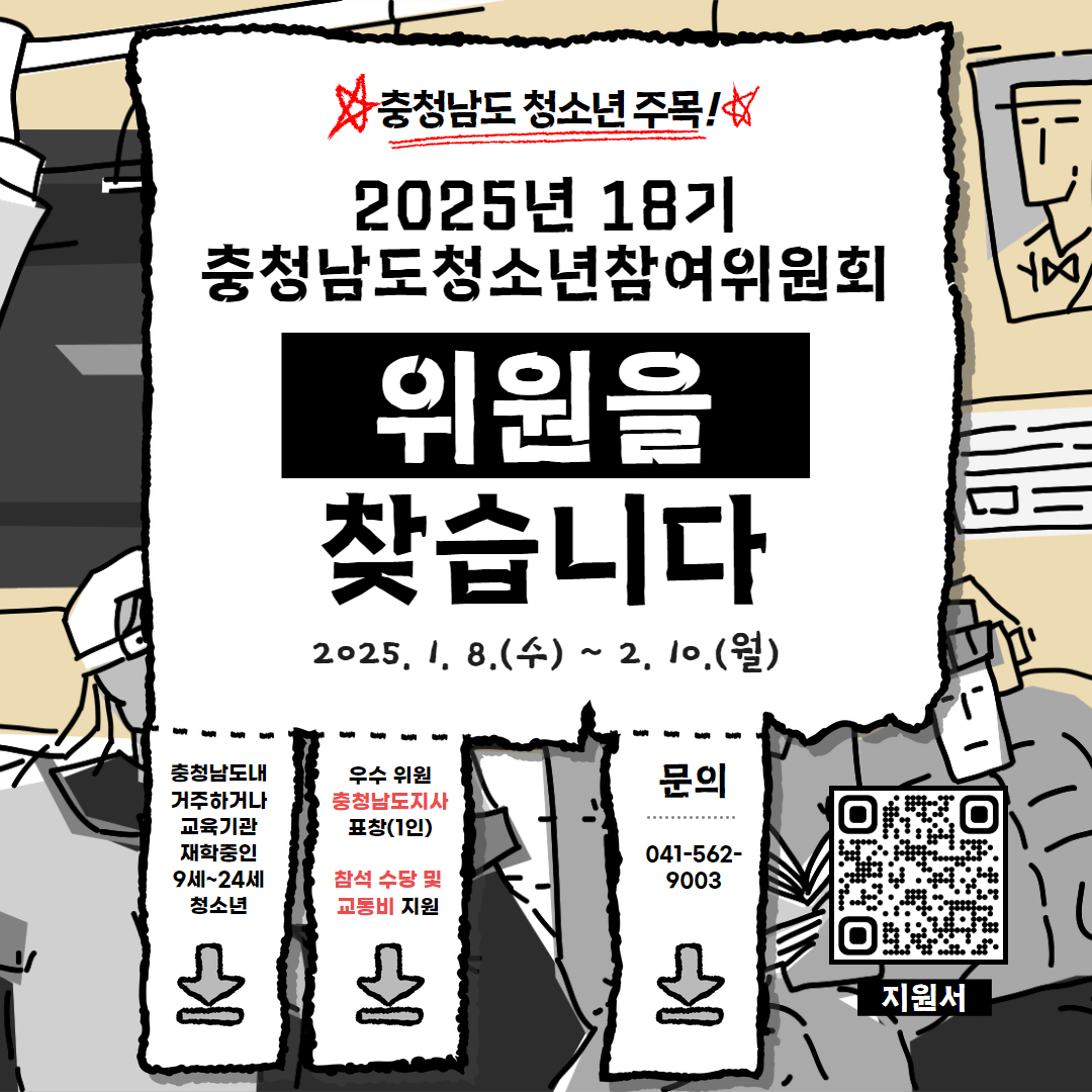 충남사회서비스원 활동진흥센터에서는 도내 청소년 정책 및 사업과정에 청소년들이 주체적으로 참여하고,청소년들의 권익 증진을 도모하고자 「2025년 18기 충청남도청소년참여위원회」를 모집하오니 도내청소년들의 많은 관심과 참여 바랍니다.